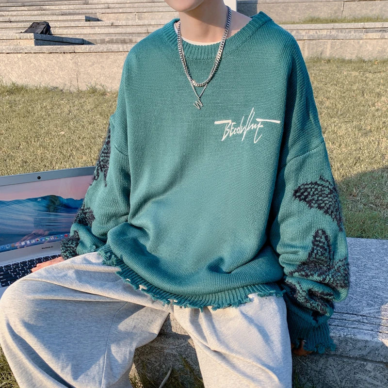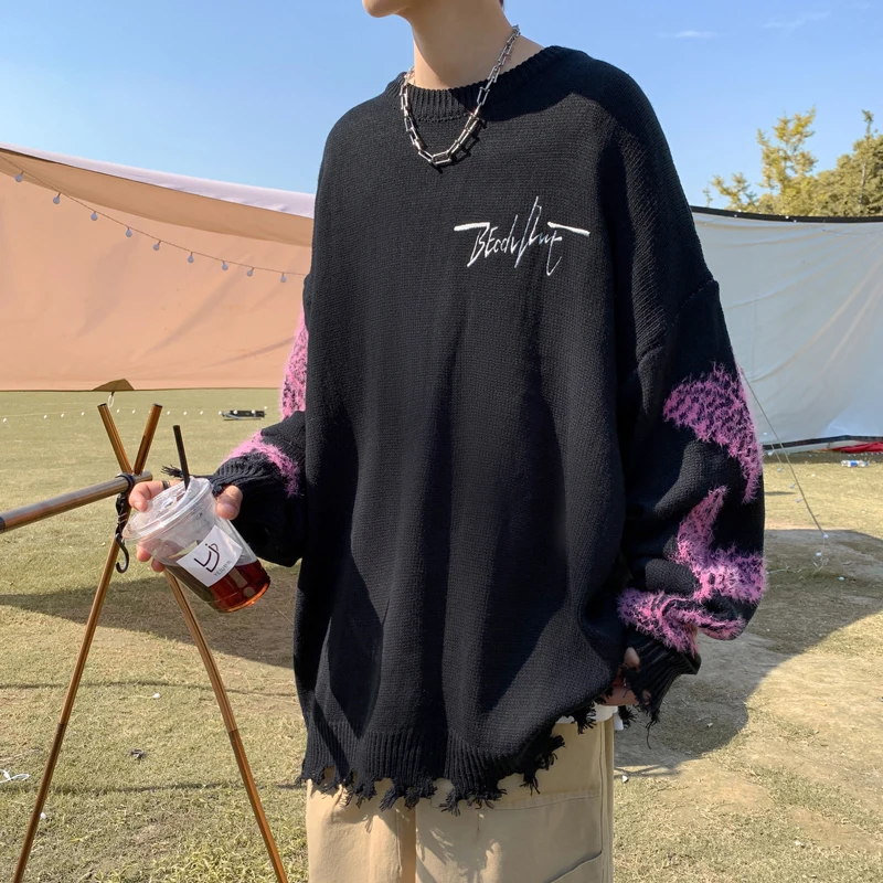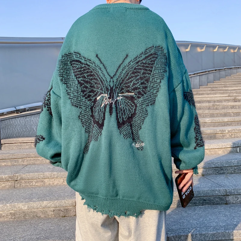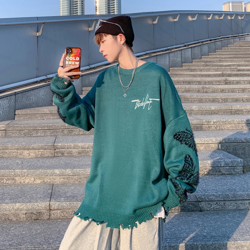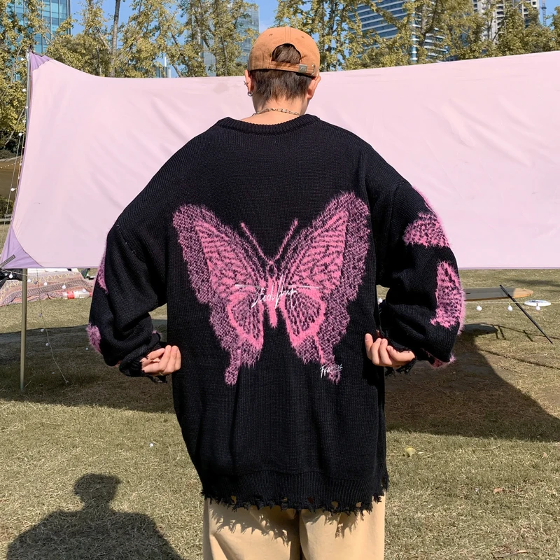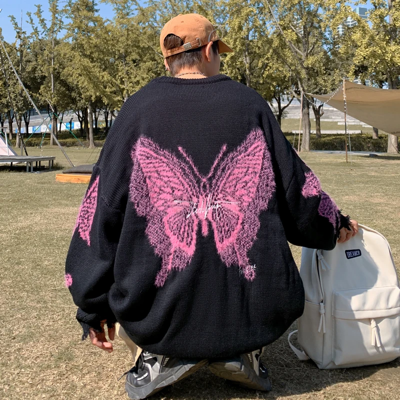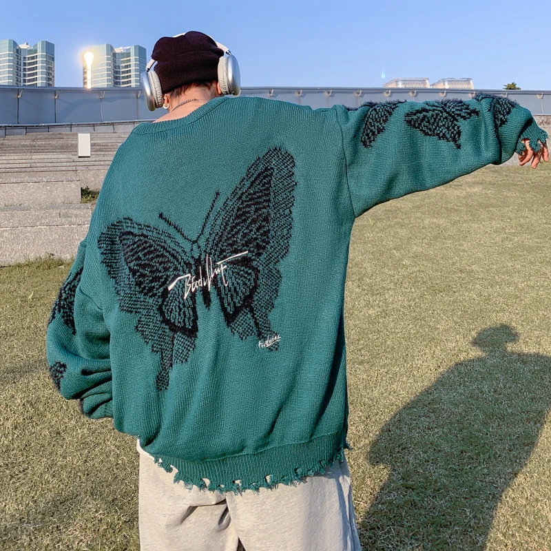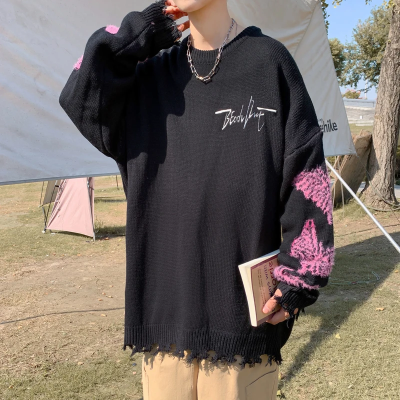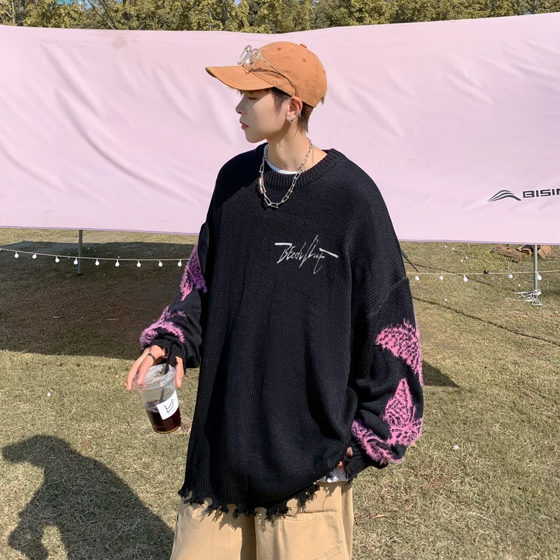 Hearujoy Hem cut butterfly sweater coat national tide high street American style loose fashion color matching round neck sweater loose
