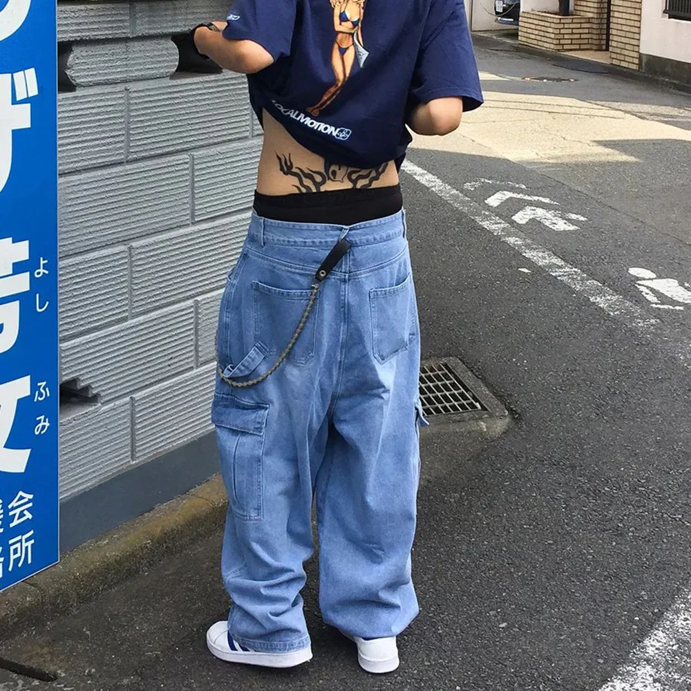 Hearujoy Jeans Y2K Mens Baggy Denim Cargo Trousers Stylish American Vintage Light Wash Streetwear Pockets Urban Fashion Men's Clothing