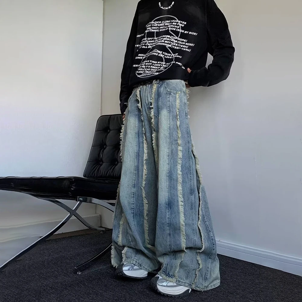 Hearujoy Mens Pants Heavy-Duty Frayed Edge Splicing Design Washed Worn Denim Jeans Autumn Hawaiian Vintage Baggy Wide Leg Pants Unisex