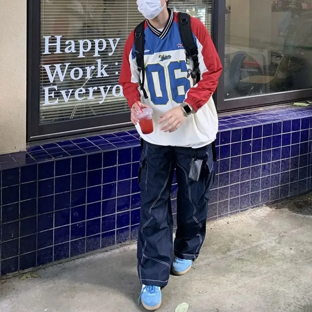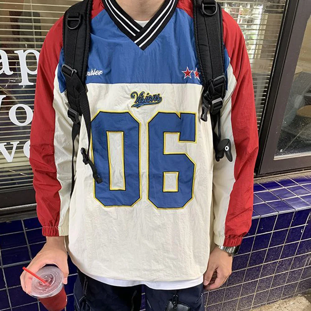 Hearujoy Mens Pullover Sports American Retro Splicing Letter Embroidery Jersey Varsity Casual Streetwear Easy Fit Trendy Long Sleeve Top