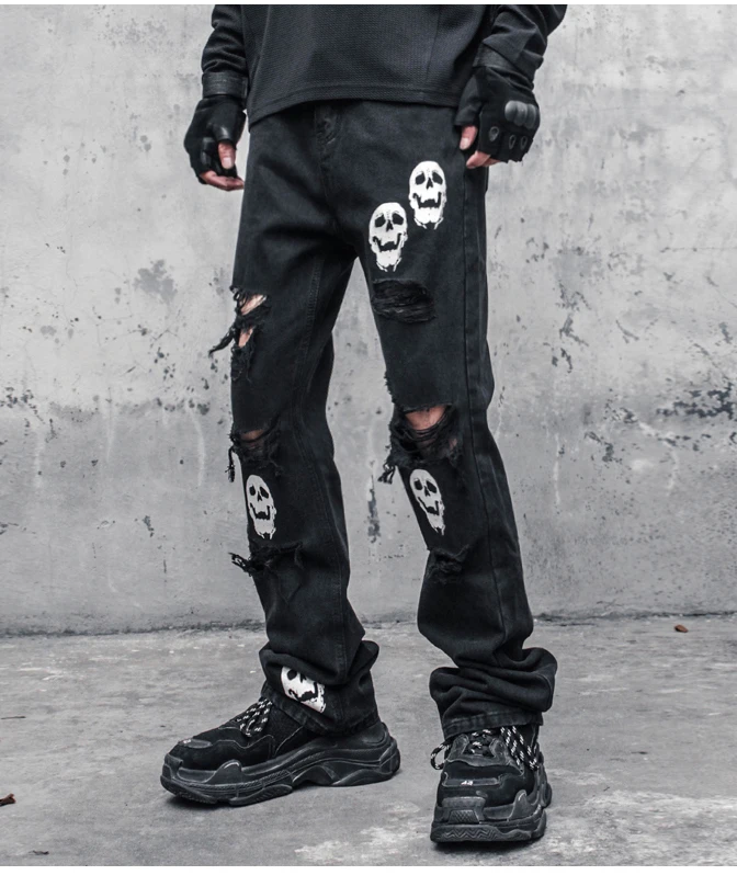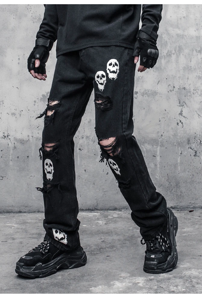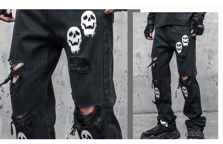 Hearujoy Skinny Jeans Pants Black Men Streetwear Destroyed Ripped Skull Printed Jeans Hip Hop Denim Pant Hole WB321